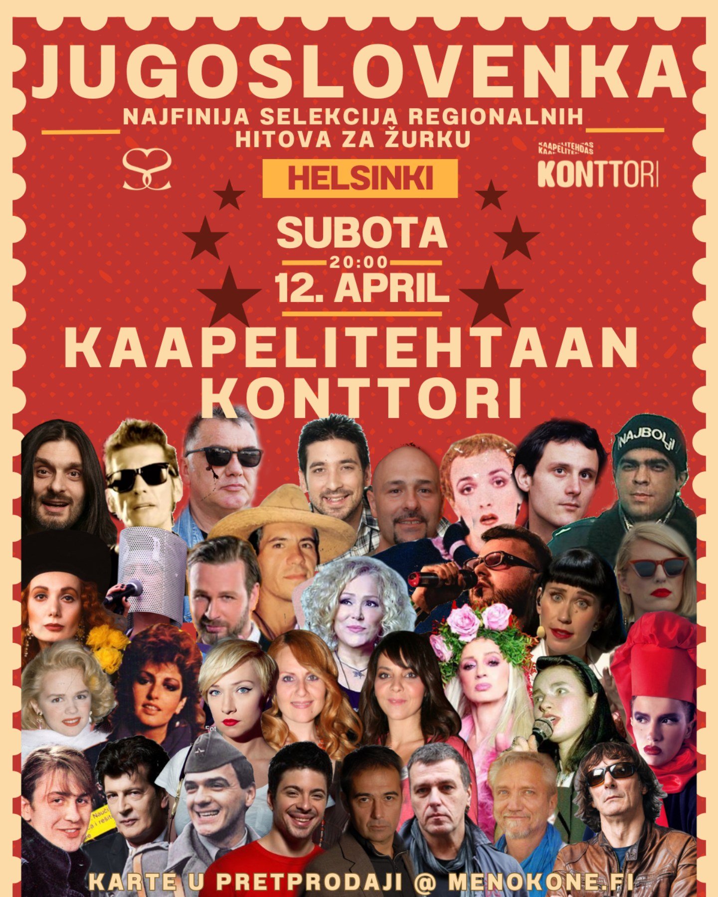 HIENOIN VALIKOIMA EX-YU HITTIBIISEJÄ Viiden vuoden ajan JUGOSLOVENKA-juhla on täyttänyt Belgradin klubit Šlep, Štrafta ja Pop Quart, ja viimeisen kahden vuoden aikana se on myyty loppuun yli 30 klubissa entisen YU:n alueella ja useissa Euroopan suurissa kaupungeissa. JUGOSLOVENKA (Jugoslavinainen) saapuu lauantaina 12. huhtikuuta ensimmäistä kertaa Helsinkiin Kaapelitehtaan Kahvibaariin (aikaisemmin Konttori), osoite Tallberginkatu 1. Ovet avataan